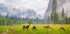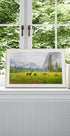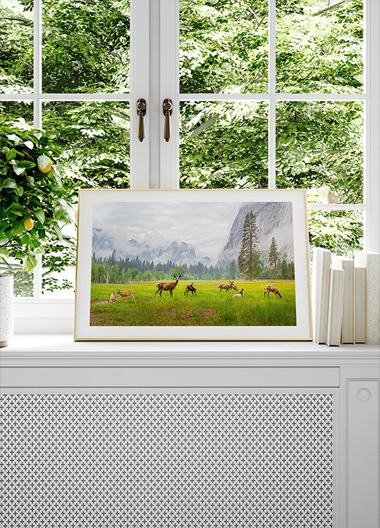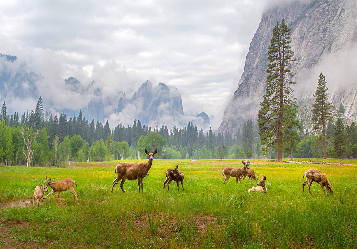 Rehe treiben durch eine neblige Yosemite-Wiese, Geweihe fangen das erste Gold der Morgendämmerung ein, während hoch aufragende Kiefern und ferne Klippen wie Wächter aufragen. Diese eindrucksvolle Szene von Dianne Mao ist eine stille Prozession der Wildnis und lädt zu einer zeitlosen Pause ein – wo Tal, Wald und Herde in uralter Harmonie atmen. Atme die Stille ein.