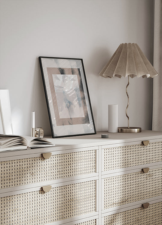 Ein weiches abstraktes Poster mit geschichteten Pinselstrichen in Pastellbeige, Grau und Weiß, gerahmt in dezenten geometrischen Quadraten. Die luftigen Texturen und die gedämpfte Farbpalette schaffen eine ausgewogene Komposition, die sowohl modern als auch ruhig wirkt – perfekt für skandinavische Innenräume, minimalistische Dekoration oder beruhigende Galeriewände.