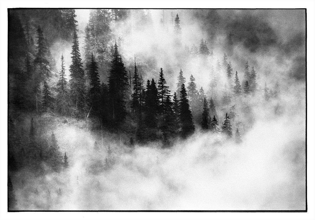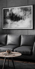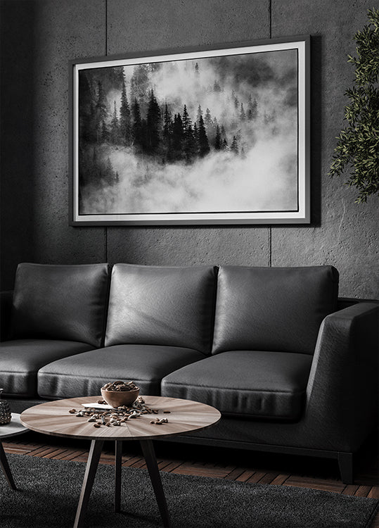 Ein dramatisches Schwarz-Weiß-Poster eines nebelverhangenen Waldes, aus dem hohe Tannen hervorragen. Es wurde in Polen aufgenommen und schafft eine Atmosphäre des Mysteriums und der Ruhe – ideal für minimalistische und moderne Häuser.