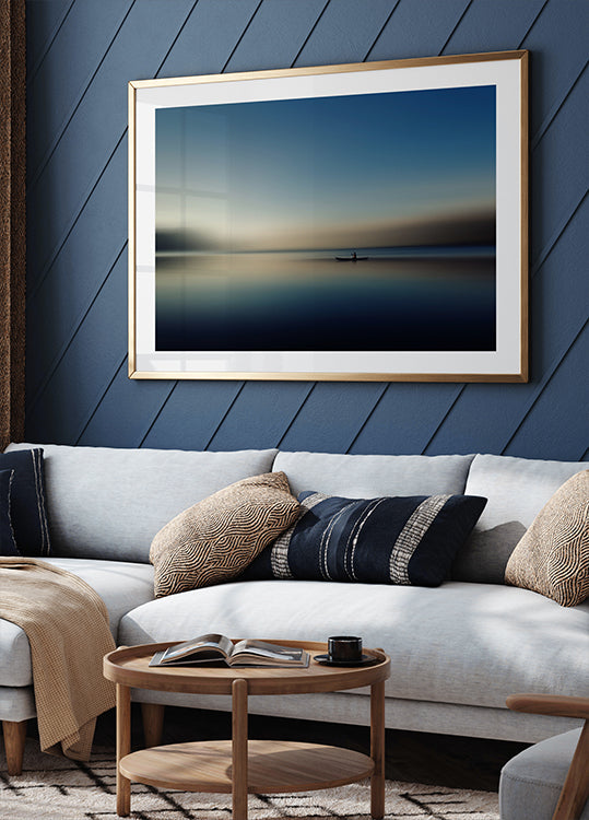 Eine friedliche Wasserlandschaft, in der ein einsamer Ruderer unter einem sanften Himmel in Farbtönen über stilles Wasser gleitet. Mit malerischer Unschärfe und minimalistischer Komposition ruft das Werk Gefühle der Einsamkeit, des Friedens und der spirituellen Ruhe hervor und fängt die stille Schönheit der Isolation und den meditativen Rhythmus des Einsseins mit der Natur ein.