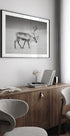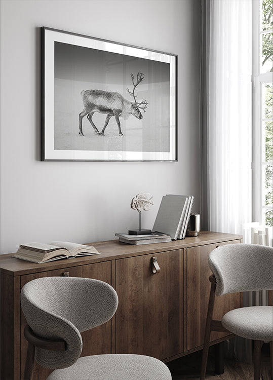 En ensom rensdyrsilhuet står i den arktiske ødemark, omgivet af endeløse, sneklædte flader og en stille, vindfejet horisont. I sort-hvid fremhæves gevirernes skulpturelle linjer og vinterens rå ro. Et billede af stilhed og styrke skabt af Giovanni Venier – perfekt til nordisk minimalisme. Skaber ro i stuen, soveværelset eller kontoret.