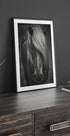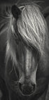 Ein beeindruckendes Schwarz-Weiß-Porträt eines Islandpferdes, dessen Mähne in einem stilvollen, windgepeitschten Look nach vorne fällt. Die monochromen Töne betonen die raue Textur der Haare und die ruhige Kraft des Tieres und schaffen so ein kühnes und dennoch intimes Tierporträt. Perfekt für Naturliebhaber und minimalistische Innenräume.