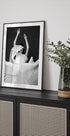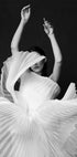 Ein eindrucksvolles Schwarz-Weiß-Porträt einer Frau in einem skulpturalen Faltenkleid, aufgenommen mitten in der Bewegung. Die dramatischen Falten und der fließende Stoff erzeugen ein Gefühl von Rhythmus und Eleganz, das sowohl an Tanz als auch an abstrakte Skulpturen erinnert. Ein kühnes monochromes Kunstwerk, das Mode, Bewegung und Kunst vereint.