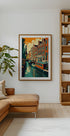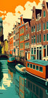 Taudalpois Amsterdam Canal Houses fängt den Charme der schmalen Giebelhäuser der Stadt entlang des Kanals ein. Warme Orangetöne spiegeln sich im Wasser, während Boote und Fahrräder eine ruhige Bewegung durch die historischen Straßen suggerieren. Ein nostalgisches Reiseplakat mit grafischer Klarheit und modernem Vintage-Feeling. Perfekt für Liebhaber von Amsterdam und nordischer Stadtpoesie.