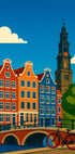 Träumen Sie von einer Reise nach Amsterdam mit dieser farbenfrohen Illustration eines Fahrrads an einem ruhigen Kanal, umgeben von Bäumen und ikonischen Giebelhäusern. Sonnenstrahlen spiegeln sich im Wasser, während Retro-Reisestil auf modernen Minimalismus trifft. Ein eindrucksvolles Werk von Taudalpoi, perfekt für Stadtliebhaber. Eine Hommage an Fernweh, Nostalgie und nordische Farbpoesie.