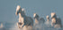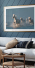 Ein beeindruckendes Foto der wilden weißen Pferde der Camargue, aufgenommen, während sie durch die Wellen galoppieren. Wassertropfen glitzern in der Luft und unterstreichen ihre Kraft, Bewegung und ihren wilden Geist. Diese atemberaubende Szene drückt Freiheit, Energie und die zeitlose Schönheit der Natur aus.