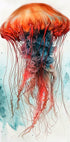 Eine atemberaubende Aquarellillustration einer Qualle mit feurig orangefarbener Glocke und langen Strängen, die anmutig in Blautönen schweben. Dieses Meereskunstwerk fängt die Eleganz des Unterwasserlebens mit malerischen Details ein und vereint Kunst und Natur in einer atemberaubenden Wasserszene.