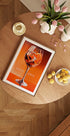 Ein leuchtend orangefarbener Kunstdruck mit einem Glas Aperol Spritz, Eiswürfeln und einer frischen Orangenscheibe. Dieses frische und sommerliche Kunstwerk bringt einen Hauch von Sommer ins Zuhause – perfekt für Küchen, Bars und moderne Innenräume mit lebendiger Atmosphäre.