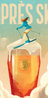 Ein verspieltes Après-Ski-Poster, das einen Skifahrer zeigt, der ein schaumiges Bierglas hinunterrast, eine Mischung aus alpinem Abenteuer und Après-Ski-Feier. Mit kräftigen Farben und humorvollen Illustrationen fängt das Kunstwerk die Freude am Wintersport, festliche Getränke und die lebhafte Atmosphäre des Bergurlaubs ein.