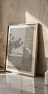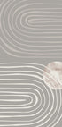 Ein minimalistisches abstraktes Poster mit fließenden Bogenlinienmustern in sanftem Beige auf einem gedämpften grauen Hintergrund, hervorgehoben durch einen strukturierten Kreis. Die organische Geometrie sorgt für einen ruhigen und ausgewogenen Ausdruck, ideal für japanische, nordische oder moderne minimalistische Innenräume.