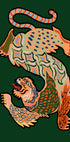 Eine auffällige abstrakte Illustration eines stilisierten Tigers in leuchtenden Farben vor einem kräftigen grünen Hintergrund. Das Kunstwerk kombiniert geometrische Muster, fließende Linien und lebendige Texturen, um eine moderne Interpretation des Katzengeistes zu schaffen. Ein einzigartiges, von Tieren inspiriertes Kunstwerk für Liebhaber modernen Designs.