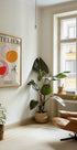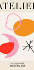 Ein modernes abstraktes Poster mit auffälligen grafischen Formen in Rot, Rosa und Orange mit schwarzen Liniendetails. Dieses im minimalistischen Stil gestaltete Kunstwerk mit dem Text „Atelier – Museum of Modern Art“ fängt die Essenz modernen Designs ein und passt perfekt zu stilvollen Innenräumen.