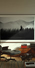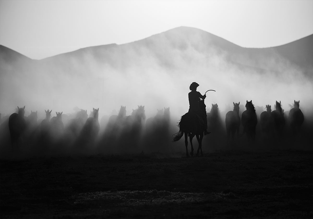Ein dramatisches Schwarz-Weiß-Foto eines Cowboys, der durch eine Herde Wildpferde reitet, umgeben von Nebel und Staub. Mit starken Silhouetten und filmischen Tönen fängt dieses Kunstwerk Freiheit, Bewegung und raue Natur ein.