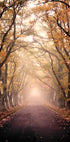 Eine verträumte Herbstgasse, flankiert von hohen Eichen, deren goldene Blätter durch den sanften Nebel leuchten. Die neblige Atmosphäre erzeugt ein Gefühl von Ruhe und Geheimnis und führt den Blick auf die endlose Straße. Ein fantastischer saisonaler Druck, der Herbstlandschaften einfängt.