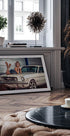 Ein kühnes Retro-inspiriertes Kunstwerk mit einem glamourösen Pin-up-Model, das auf der Motorhaube eines Oldtimer-Ford Mustang sitzt. Mit Getränkedosen im Haar als Lockenwickler, High Heels und einem verspielten Lippenstift vereint dieses Stück Mode, Nostalgie und Autokultur in einer stilvollen Komposition. Perfekt für Liebhaber klassischer Autos, Retro-Ästhetik und einzigartiger Wandkunst.