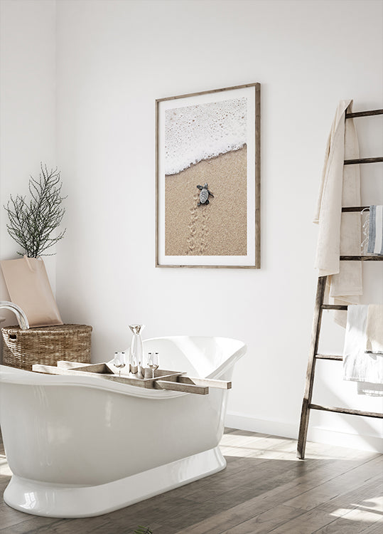 Ein inspirierendes Foto, das den Moment einfängt, als eine kleine Schildkröte den Meeresrand erreicht. Kleine Fußabdrücke führen zur Schildkröte, wenn sich der weiche Meeresschaum nähert. Das Bild symbolisiert den Beginn einer außergewöhnlichen Reise und ist ideal für Naturliebhaber oder diejenigen, die erhebende Kunst suchen, die Mut und Abenteuer feiert.