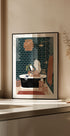 Eine gemütliche Illustration einer Frau, die sich in einer Badewanne entspannt und mit einem Handtuch um den Kopf ein Buch liest. Umgeben von moderner Badarmatur, warmen Erdtönen und einem Hauch Grün strahlt das Werk Ruhe und Gelassenheit aus. Perfekt, um eine entspannte Atmosphäre im Zuhause zu schaffen.