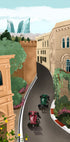 Eine farbenfrohe Illustration von Formel-1-Autos, die durch die historischen Straßen von Baku, Aserbaidschan, fahren. Das Kunstwerk verbindet den Charme der alten Architektur mit der modernen Skyline mit den ikonischen Flame Towers im Hintergrund. Ein dynamisches Werk, das die Geschwindigkeit, Kultur und Spannung des Baku Grand Prix einfängt.