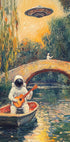 Ein surreales Gemälde im impressionistischen Stil von Astronauten in einer erdigen Landschaft. Ein Astronaut sitzt in einem Boot und spielt Gitarre, während ein anderer von einer Steinbrücke unter einem goldenen Himmel gestikuliert. Über ihnen schwebt ein UFO, das in einer humorvollen und fantasievollen Szene Science-Fiction mit Kunstgeschichte verbindet.