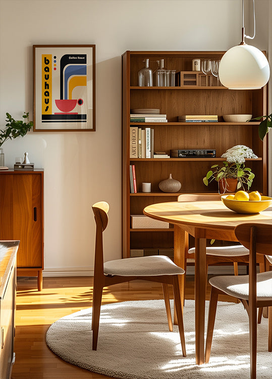 Ein vom Bauhaus inspiriertes Kaffeehaus-Poster mit kräftigen geometrischen Formen in Rot, Gelb, Blau und Schwarz. Das abstrakte Design zeigt eine dampfende Kaffeetasse im reinen Bauhaus-Stil, die Funktionalität mit künstlerischer Schlichtheit verbindet. Perfekte Wandkunst für Retro-Küchen, Cafés und Liebhaber des Vintage-Modernismus.
