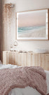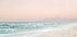 Ein friedliches Küstenfoto, das türkisfarbene Wellen einfängt, die unter einem dunstigen, pastellfarbenen Himmel sanft an einen Sandstrand plätschern. Die fernen Berge bilden einen verträumten Horizont, der Ruhe und Urlaubsatmosphäre hervorruft.
