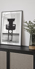 Ein beeindruckendes Schwarz-Weiß-Küstenfoto, das einen Rettungsschwimmerturm zeigt, der hoch am Strand steht. Die starken Kontraste betonen die geometrische Struktur des Turms vor dem ruhigen Meereshorizont. Ein minimalistisches und dennoch kraftvolles Kunstwerk, perfekt für moderne Innenräume mit Küsten- oder Monochrom-Look.