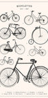 Eine detaillierte Schwarz-Weiß-Illustration von Vintage-Fahrrädern von 1871 bis 2007. Mit ikonischen Modellen wie Kenwood, Columbia und Grand Bi fängt dieses nostalgische Kunstwerk die Geschichte des Fahrrads ein. Perfekt für zu Hause, in Fahrradgeschäften oder um einer Galeriewand Retro-Charme zu verleihen.