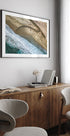 Eine atemberaubende Drohnenaufnahme der kalifornischen Küste bei Big Sur. Die tosenden Wellen treffen in einer verführerischen, abstrakten Komposition aus Naturtexturen auf die Sandküste. Perfekt, um die Schönheit und Ruhe der Küste in Ihr Zuhause zu bringen.