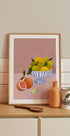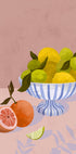 Eine bezaubernde Stilllebenillustration einer gestreiften Schüssel gefüllt mit Zitronen und Limetten, begleitet von einer geschnittenen Blutorange und einer Limettenscheibe. Mit warmen Tönen und malerischen Texturen verleiht dieses Kunstwerk eine frische, mediterran inspirierte Atmosphäre, perfekt für eine Küche oder ein Esszimmer.