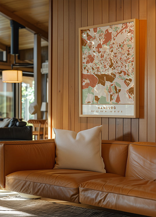Ein dramatisches, schwarzes Poster in Erdtönen, auf dem sich ein detaillierter Stadtplan als grafisches Netzwerk aus Straßen, Kanälen und Stadtvierteln entfaltet. Emiliano Deificus kombiniert Minimalismus und warme Farben für einen zeitgenössischen Ausdruck, der dem Raum Tiefe und Richtung verleiht und zu neuen urbanen Entdeckungen einlädt. Dezente Konturen betonen den Rhythmus der Stadt.