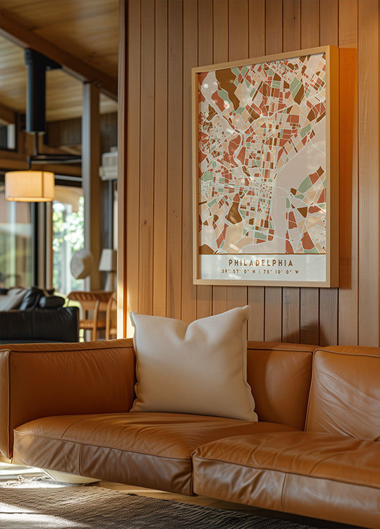 Black Maps Earth Tones 65 von Emiliano Deificus kombiniert ein detailliertes Straßenraster von Philadelphia mit tiefen, erdigen Farbtönen. Schwarze Linien zeichnen die lebendige Struktur der Stadt nach, während warme Töne einen ruhigen Kontrast schaffen. Ein grafisches, modernes Poster, das sowohl Wohnzimmer als auch Büro mit urbaner Eleganz aufwertet. Perfekt für schlichte, nordische Ästhetik.