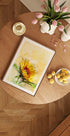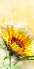 Ein lebendiges Aquarellgemälde einer Sonnenblume voller tropischer Sommerenergie. Die malerischen Texturen und leuchtend gelben Blütenblätter bringen Wärme und Freude, ein perfektes Kunstwerk für botanische oder saisonal inspirierte Dekorationen.