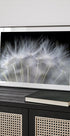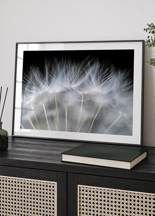 Eine zarte Makrofotografie von Löwenzahnsamen, die ihre federleichte Weichheit und Schönheit einfängt. Die Nahaufnahme unterstreicht die Fragilität und Flüchtigkeit dieser luftigen Büschel.