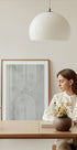Ein minimalistisches abstraktes Poster mit weißen, geschwungenen Linien, die sich in Symmetrie auf einem sanft grauen, strukturierten Hintergrund spiegeln. Inspiriert von der modernen Ästhetik der Mitte des Jahrhunderts und einer monochromen Farbpalette vereint das Kunstwerk Ausgewogenheit und Einfachheit und eignet sich perfekt für zeitgenössische Innenräume und skandinavisch inspirierte Räume.