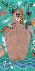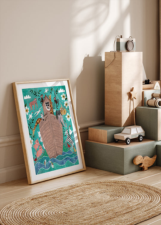 Eine verspielte und farbenfrohe Illustration der Arche Noah, gefüllt mit Tieren wie Giraffen, Elefanten, Zebras, Affen und Vögeln. Umgeben von üppigen Blumen und lebendigem Wasser fängt dieses bezaubernde Kunstwerk die Freude und Fantasie der beliebten Bibelgeschichte ein. Perfekt für Kinderzimmer, Kindergärten oder für alle, die Tierillustrationen lieben.
