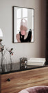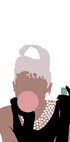 Diese Illustration ist eine verspielte, moderne Interpretation einer klassischen Ikone und zeigt eine glamouröse Frau mit Perlen und Handschuhen, die Kaugummi bläst. Der minimalistische Stil und die starken Kontraste verbinden Vintage-Eleganz mit frecher Pop-Art, perfekt für Modeliebhaber und moderne Einrichtung.