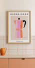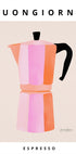 Eine stilvolle und minimalistische Illustration einer Mokkakanne in den Farbtönen Pfirsich und Rosa, mit dem Text „Buongiorno“ oben und „Espresso“ unten. Perfekte Wandkunst für die Küche, Kaffeeliebhaber oder alle, die italienische Morgenrituale zu schätzen wissen.