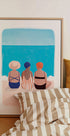 Eine helle und fröhliche Illustration von drei Frauen, die zusammen am Meer sitzen und die Sonne und die Aussicht genießen. Ein perfektes Kunstwerk, um ein Gefühl von Urlaub, Entspannung und Sommerstimmung von der Küste in Ihr Zuhause zu bringen.