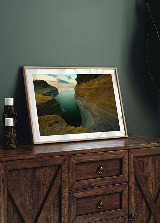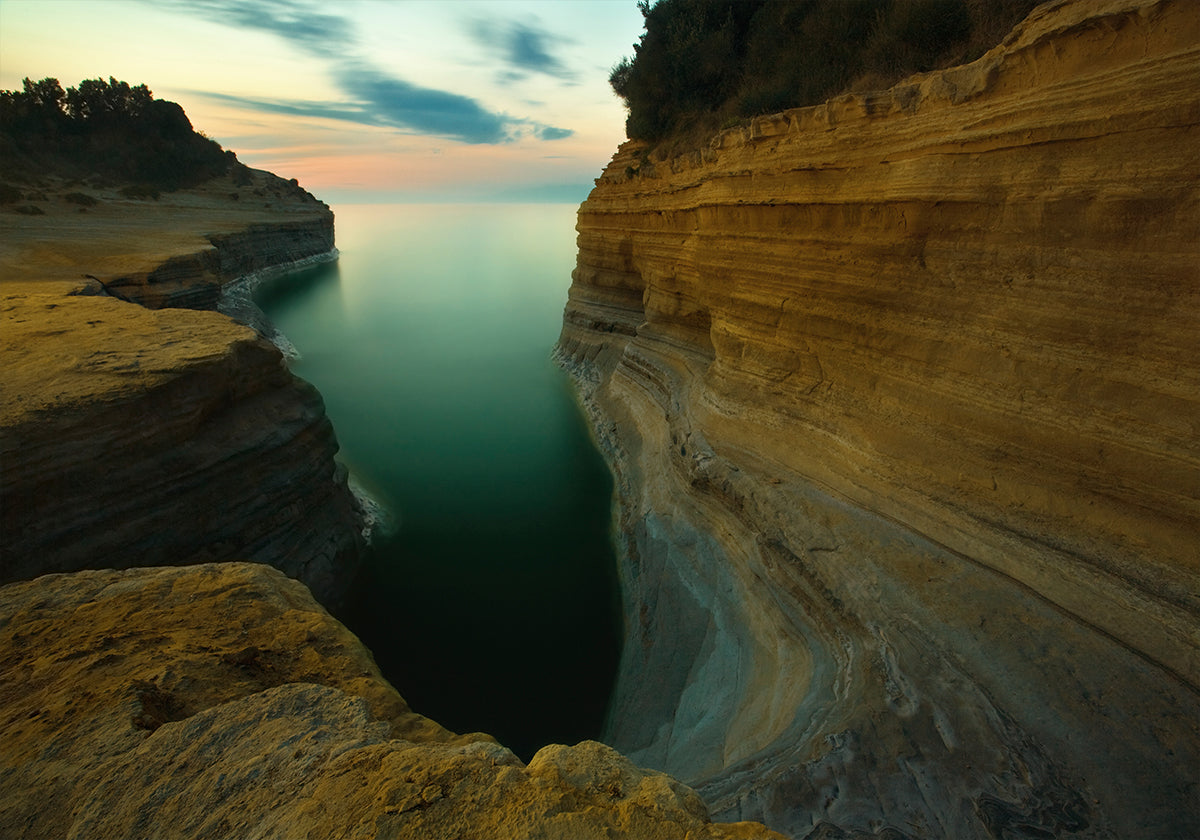 Eine ruhige Langzeitbelichtungsaufnahme des berühmten Canal d'Amour in Korfu, Griechenland. Das smaragdgrüne Wasser wird von dramatischen Sandsteinfelsen eingerahmt und schafft eine geheimnisvolle und romantische Atmosphäre. Diese Küstenlandschaft fängt die natürliche Schönheit, zeitlose Ruhe und den legendären Charme des Ionischen Meeres ein.