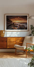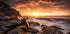 Eine atemberaubende Meereslandschaft am Cape Solander, Sydney, aufgenommen bei Sonnenaufgang. Das goldene Sonnenlicht strömt über den Horizont und beleuchtet die Wellen des Meeres und die rauen Felsen mit einem warmen, leuchtenden Licht. Das seidige Wasser, das durch die Langzeitbelichtung entsteht, kontrastiert wunderbar mit dem dramatischen, wolkenverhangenen Himmel und strahlt sowohl Kraft als auch Ruhe aus.