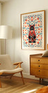 Eine verspielte und farbenfrohe Illustration einer lächelnden Katze im Design einer russischen Matroschka-Puppe, verziert mit roten und blauen Blumen. Perfekt für Kinderzimmer, charmante Innenräume oder für alle, die skurrile Katzenkunst mit fröhlichem Ausdruck lieben.