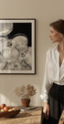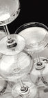 Ein raffiniertes Schwarz-Weiß-Foto eines Champagnerturms mit feinen Reflexionen und Blasen in einem Vintage-Coupé-Glas. Dieses zeitlose Stillleben fängt die Eleganz der Party ein und ist eine schöne Ergänzung für moderne Küchen, Esszimmer und stilvolle Innenräume.