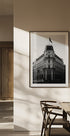 Ein majestätisches Schwarz-Weiß-Foto eines historischen Gebäudes in Kopenhagen, gekrönt von einem Glockenturm und einer eleganten Flagge. Die detaillierte Fassade und die großartige Symmetrie spiegeln den zeitlosen europäischen Charme wider und machen diesen Druck zu einem anspruchsvollen Wandkunstwerk für Innenräume, die von Architektur, Kultur und klassischem Stadtleben inspiriert sind.