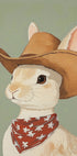 Ein schönes und verspieltes Kunstwerk eines als Cowboy gekleideten Kaninchens mit breitem Hut und gemustertem Bandana. Dieses humorvolle Tierporträt verbindet rustikalen Western-Charme mit fantasievollem Humor – perfekt für Tierliebhaber und skurrile Heimdekoration.