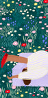 Eine skurrile und fröhliche Illustration einer Frau, die auf einer Wiese voller bunter Blumen liegt. Mit leuchtenden Farben, verspielten Details und einem Gefühl der Entspannung fängt dieses Kunstwerk die Schönheit von Achtsamkeit, Sommer und Tagträumen in der Natur ein.