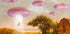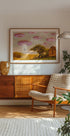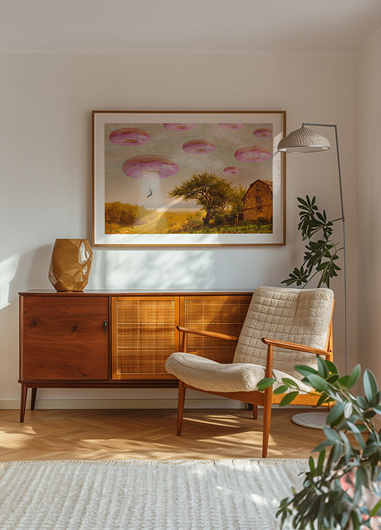 Ein surreales und humorvolles Kunstwerk, das klassische Landschaftsmalerei mit Pop-Art-Absurdität vermischt – riesige rosa Donuts schweben wie UFOs am Himmel, wo ein Lichtstrahl eine menschliche Figur aufsaugt. Eine witzige Mischung aus pastoraler Landschaft und moderner Parodie, perfekt für lustige Wohnkultur und Kunstliebhaber mit Sinn für Fantasie.