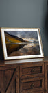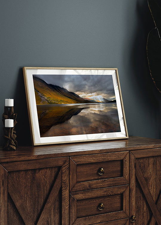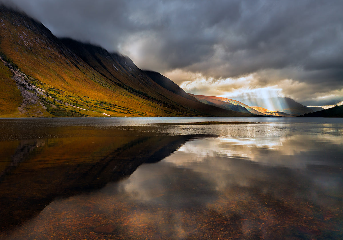 Ein atemberaubendes Landschaftsposter aus Glencoe, Schottland, wo sich dramatische Wolken öffnen und Sonnenstrahlen über das Hochland und den See fallen. Das ruhige Wasser spiegelt die schroffen Berge wider und schafft eine kraftvolle und dennoch friedliche Komposition, die die Harmonie und Stille der Natur einfängt.