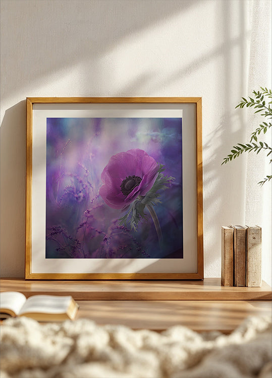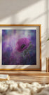 Ecstasy von Natalia Simongulashvili (NATALIORION) fängt einen verträumten botanischen Moment ein: Sanfte lila Blüten und feine Grashalme tauchen in samtigem Licht auf, umrahmt von einer dezenten Vignette. Eine ruhige Blumenszene, die Eintauchen, Poesie und einen Hauch von Gartenzauber in den Raum bringt. Schafft eine schwebende, poetische Ruhe im Zuhause.