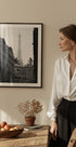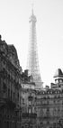 Ein zeitloses Schwarz-Weiß-Foto des Eiffelturms, der sich über den eleganten Haussmann-Gebäuden von Paris erhebt. Das sanfte Licht und der raffinierte Kontrast unterstreichen die romantische Seele der Stadt und machen diesen Druck zu einer ikonischen Wandkunstwahl für Liebhaber von Reisen, Architektur und klassischem europäischem Charme.