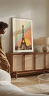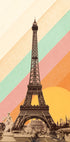 Eine auffällige Retro-inspirierte Illustration des Eiffelturms in Paris, vor einem auffälligen regenbogengestreiften Hintergrund mit einer warmen goldenen Sonne. Die Kombination aus Vintage-Fotografie und lebendigem Grafikdesign schafft ein nostalgisches und dennoch modernes, von Reisen inspiriertes Kunstwerk, perfekt für Liebhaber von Paris, Architektur und farbenfroher Wanddekoration.